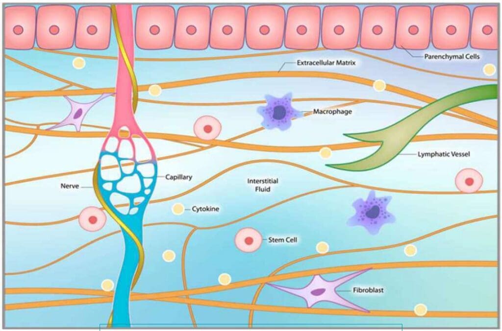 In the sections that follow, we will examine several key conceptual areas in detail. We will begin by exploring the pleiotropic nature of natural molecules and therapies, likening them to “Swiss Army knives” for their multifaceted ability to modulate inflammation, reduce fibrosis, protect cells, and orchestrate healing. We’ll explore why a single approach is often insufficient and how combining therapies such as peptides, light therapy, and advanced oxygen therapies can create a powerful synergistic effect. Central to this is the extracellular matrix (ECM) and the role of myofibroblasts in healing versus fibrosis.